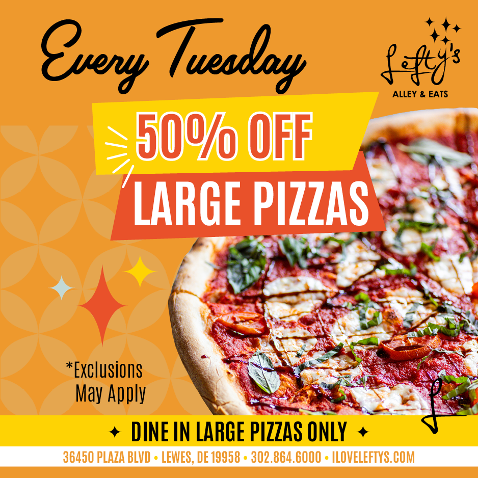 Tuesdays at Lefty’s mean 50% OFF large pizzas and honestly… that’s reason enough to celebrate. Half the price, all the flavor, from classic favorites to chef-inspired creations